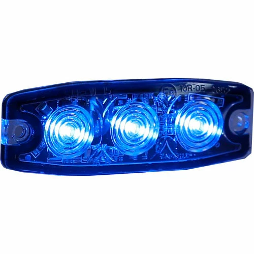 Buyers Products 3.4 Inch Blue LED Ultra-Thin Mount Strobe is designed with a slim .26 in. profile. The 12-24V strobe light has 3 LEDs and 12 flash patterns with synchronous and alternating functions. It can be fastened with screws or the included 3M® self-adhesive tape. The strobe light has an IPX8 waterproof rating as well as a SAE J595 Class 1 rating and CA13 certification. 90 degree mounting brackets are sold separately. It’s backed with a 5 year warranty.